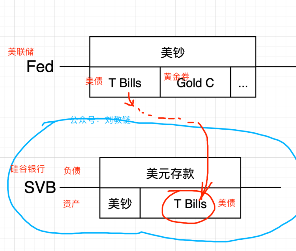 这是教链自创的几何画法,可以更加直观地定性展示资产负债表及其变化。从上图可以清楚地看出,硅谷银行(SVB)的资产主要是从市场上吸收的大量美债(作为资产),用于支撑储户的美元存款(存款是银行的负债)。而上面美联储(Fed)作为美国的央行正在向市场倾倒美债。这相当于央行把美债从自己的资产负债表中拿掉,转移到了硅谷银行们的资产负债表中。
