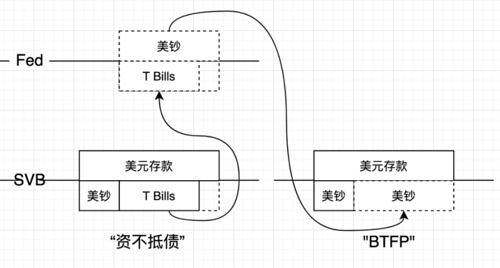 从图上看,就是美联储承诺,硅谷银行们拿缩水的美债抵押给美联储,仍然可以得到足额的美钞,放回自己的资产负债表中,从而重新平衡资产负债。比如,100 美元票面的美债当前市值缩水为 50 美元,不足以支撑 100 元的储户存款,那么硅谷银行【可以】把这价值 50 美元的美债抵押给美联储,美联储直接将其计为 100 美元的资产,加印出 100 美元美钞交给硅谷银行,放回其资产端,从而足额支撑 100 元的储户存款。
