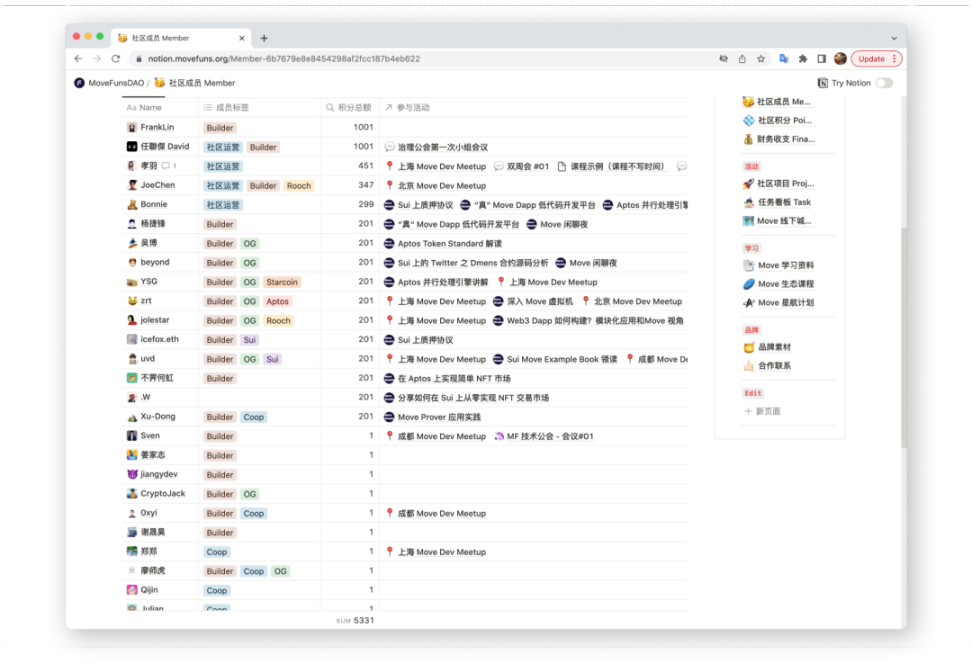 拥有 MoveFuns DAO 社区积分成员可免费加入本期全链游戏共学,报名时间截止 9 月 9 日,FOCGs Demo Day 期间若提交 Sui 全链游戏相关项目产出,还可获得 MoveFuns DAO 积分空投,具体积分统计可见官方 Notion 页面:notion.so/movefuns/Points-1aeb4163488f46a4982c435f21fdc670