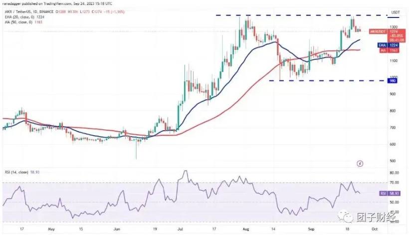 Upadhyay 指出,Maker(MKR)近日曾上涨至 1,370 美元并回落,下方可关注 20 日 EMA 点位,即 1,226 美元附近。若能从 20 日 EMA 处反弹,将有望飙升至 1,759 美元阻力;但如果跌破 20 日 EMA,可能会让币价回落至 980-1,370 美元区间震荡。