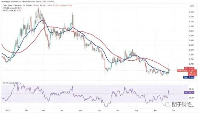 美国时间 9 月 23 日,Theta Token($THETA)曾突破 20 日 EMA 点位,并一度涨至 0.7 美元,目前则回落至 50 日 MA 下方(0.642 美元附近)。若 $THETA 能反弹突破 50 日 MA,则将有望重新挑战 0.7 美元。