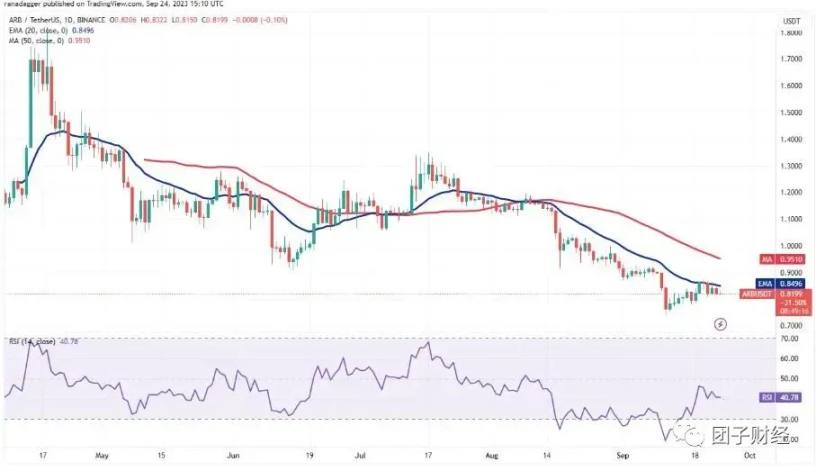 Upadhyay 指出,虽然 Arbitrum($ARB)目前处于下跌趋势,但似乎并未回落太多。目前日线上的 RSI 已经升至 40 以上,显示市场动能逐渐转正,若能进一步突破 20 日 EMA 上方,则可能会挑战 50 日 MA(0.95 美元附近),并有望涨至 1.04 美元;若持续下跌,下方两个值得关注的支撑位为:0.8、0.78 美元。