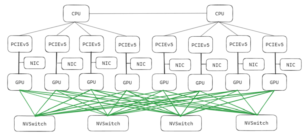 首先,NVLINK 和 NVSwitch 的组合为机内互联提供了无与伦比的性能,已经成为服务器标配,各大云计算厂商均配备和 GPU 同代的 NVLINK 来最大化服务器的性能表现。下图展示了单个服务器内的互联方案是如何实现的。绿色线条部分即 NVLINK 和 NVSwitch 组合是如何为 GPU 之间提供高达 900GBps 通讯带宽的。