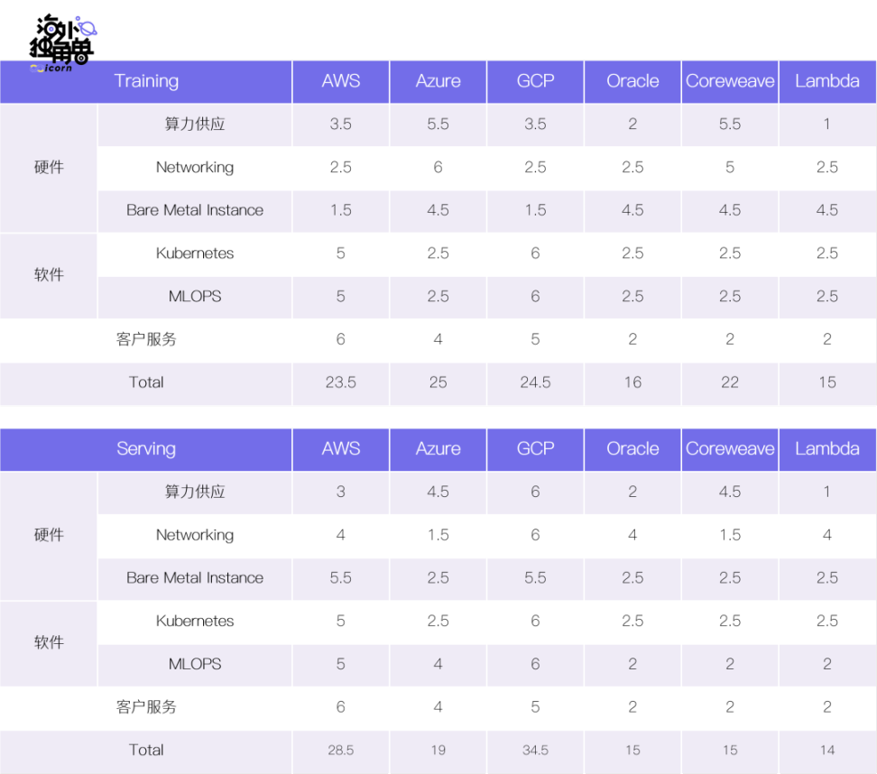 下表中是我们对云计算供应商在不同环节的打分(拾象注:这里打分的方式是如果在某一方面,AWS > Azure ≈ GCP > Oracle > Coreweave > Lambda,那么他们的评分会分别是 6,4.5,4.5,3,2,1 ),但并未考虑各个模块之间的重要性权重,读者可以根据心中对行业阶段、环节重要性等指标推测出权重,以达到更准确的推断。