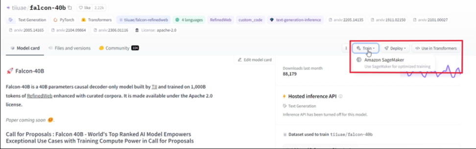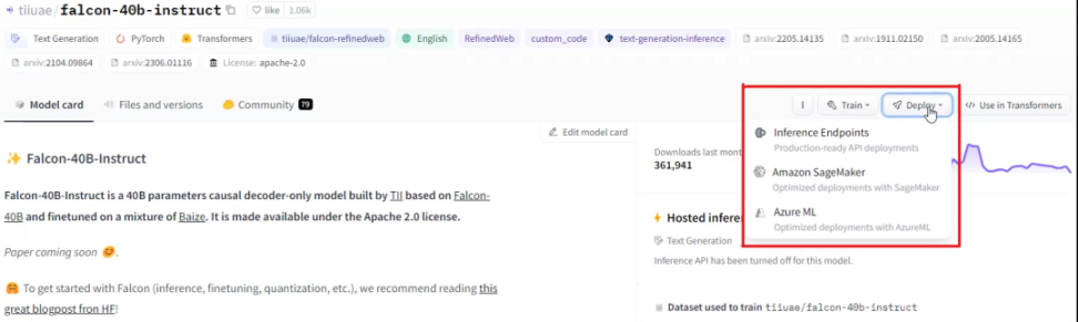 AWS 和 Azure 都能直接从 Hugging Face 上导流到 Sagemaker 或 AzureML 的 Console 界面(如下图)。不过 AWS 和 Hugging Face Inference Endpoint 所覆盖的开源模型数量更多。除开源模型外, AWS 还支持用户选取 Anthropic、Cohere、AI21 Labs 的闭源模型。