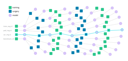三家云厂商的 Version Control 都大同小异,只是不少客户会用 Weight and Biases 的前端小设计(如下图)更直观的看到训练集和模型版本之间的关系,这样也能让用户更快找到所需的版本。