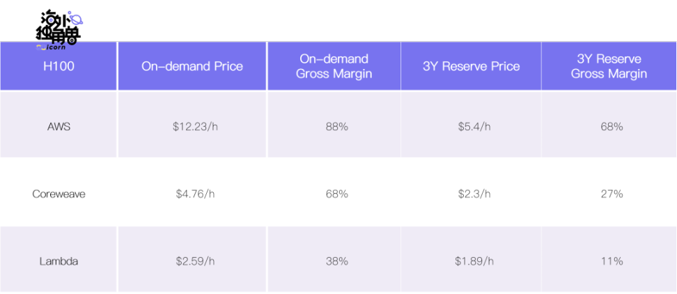 基于对 H100 的成本分析,我们对几家已推出 H100 Instances 的云计算厂商的 Gross Margin 进行推测如下: