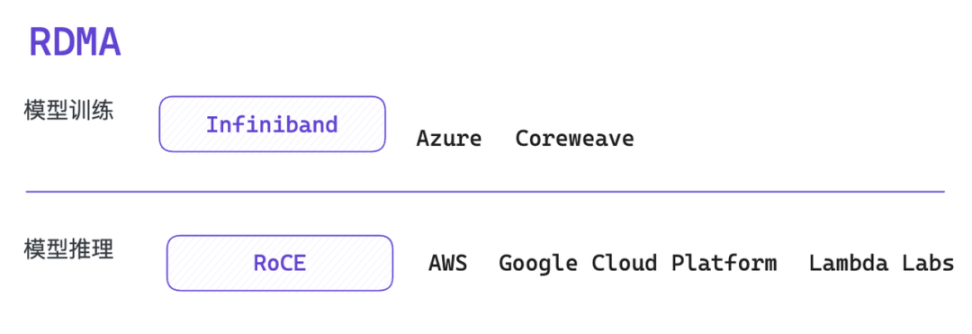 RDMA 的实现可以通过 Infiniband 或 Ethernet 协议,不同云计算公司的方案选择如下: