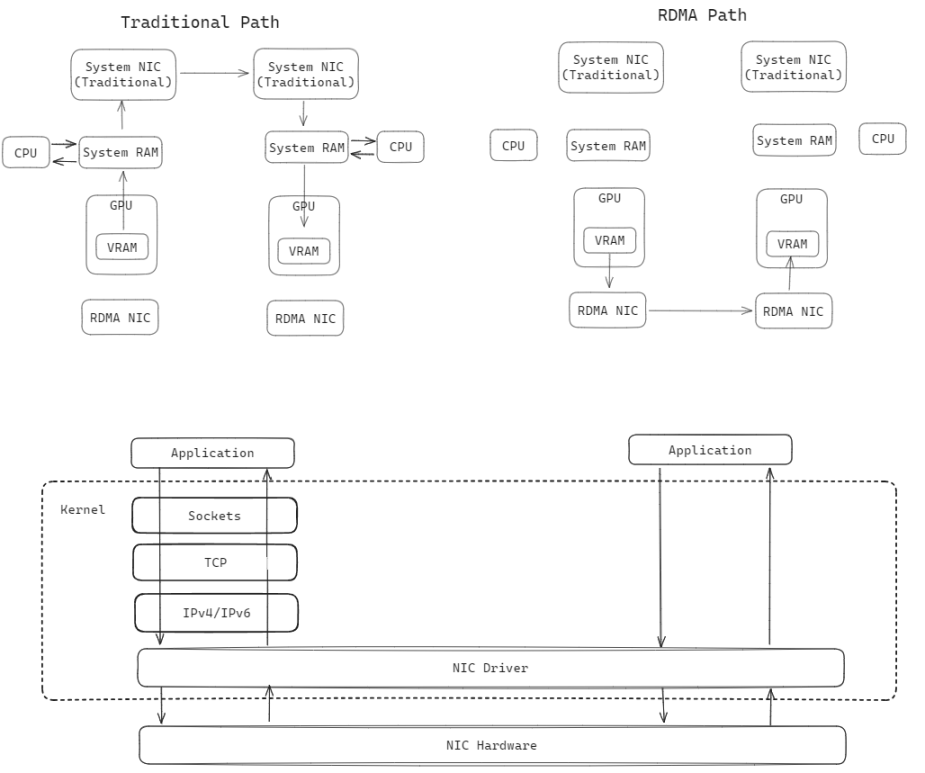 具体来说,传统互联方式在硬件上(如左上半图)需要将 GPU 的数据复制到系统内存上,并要 CPU 对数据进行多次处理以符合复杂的通信协议(如左下半图),再传输到另一台服务器上进行类似的操作。这个过程中,通讯带宽严重依赖、并受限于 CPU 的性能,并且多层的协议处理过程也让延迟极高。RDMA 的则实现了让 GPU 能绕过 CPU 和另一个 GPU 直接高效通信,是对 GPU 之间的通讯路径和相关协议的重构(如下图右侧)。