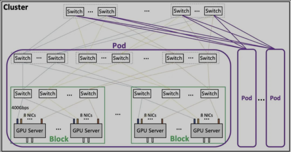 目前行业比较常见的组网方案如下,这个方案能支持 16000 台服务器、对应 12.8 万张 GPU(拾象注:单台服务器内有 8 张 GPU)的互联。目前行业内比较通用的服务器带宽为 3200 Gbps(因为单台服务器内都有 8 张 GPU,每个 GPU 各有一个 400 Gbps 的 RDMA NIC)。