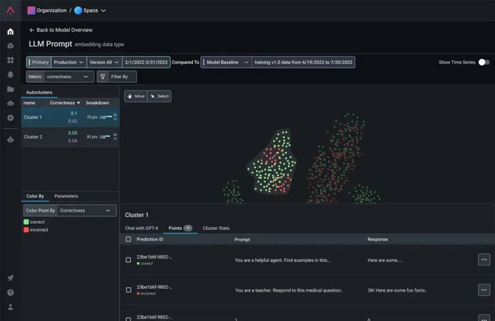 Weight&Biases 提供了更直观的 prompt engineering 的界面 (如下一图),而 Arize 则靠独特的 Embedding 算法,让用户更直观的看到有问题的 Prompts/Responses (如下二图)。
