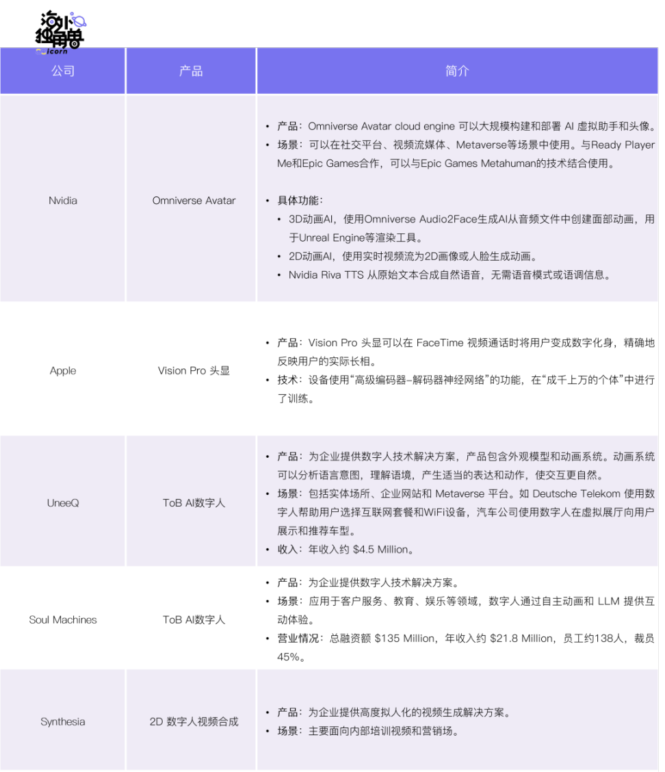 我们在前面提到,因为技术和数据集的开源,2D 数字人赛道竞争已经相当激烈,而从产品形态上,也几乎都以 Synthesia 这类视频制作和编辑平台为主,此外还包括 Soul Machine、UneeQ 等更偏技术供应商的角色。