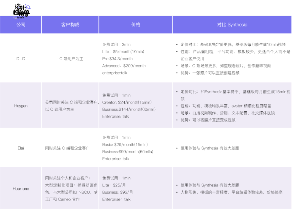 在客户访谈中,Synthesia 的客户也会倾向于将它和 Hourone、D-ID、Elai、Heygen 等2D 数字人视频生成公司进行对比,这些产品从功能上类似,和 Synthesia 一样,让用户只需要通过输入文字、点击选择不同的数字人形象(AI Avatar),就可以生成一段逼着、直接可用的视频,不同产品之间的差异主要在于视频生成质量和产品层面上。