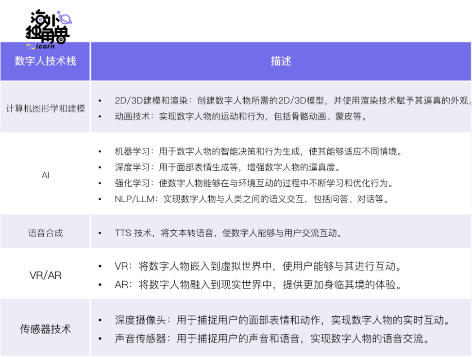 数字人技术栈主要包括计算机视觉、对话能力(早期的 NLP 和 Gen-AI 后的 LLM)、语音合成、VR/AR 等,其中 AI 技术十分重要,让数字人能够进行自然的语言交互和表情动作。
