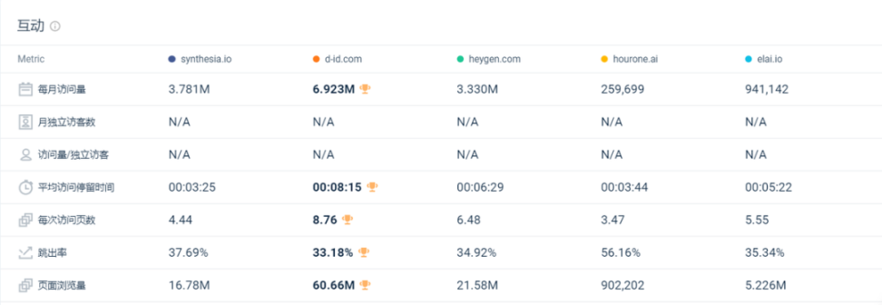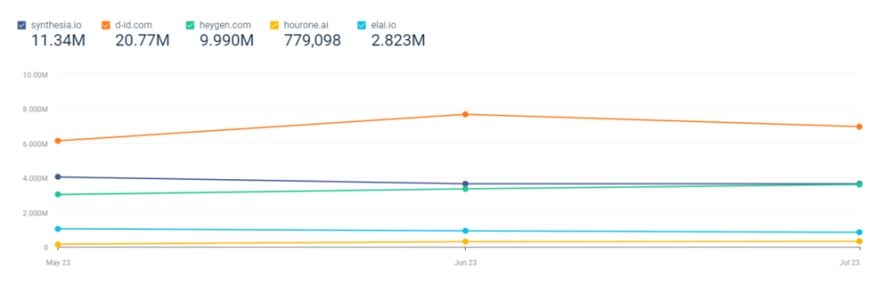 因为 Synthesia 等产品目前都只通过 Web 端体验,所以我们可以通过网站访问量对各个产品的使用量进行简单对比(备注:网站流量无法覆盖到通过部署 api 使用服务的规模)。