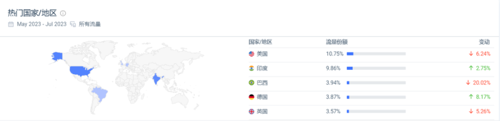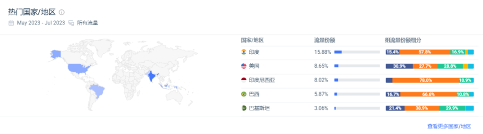 从地域分布上,可以看出印度、美国、印度尼西亚、巴西这些国家的用户较多,其中印度占据了 15.88%,D-ID 在印度、印度尼西亚、巴西这些公司具有较大的优势,而 Synthesia、Heygen 在美国的客户较多。