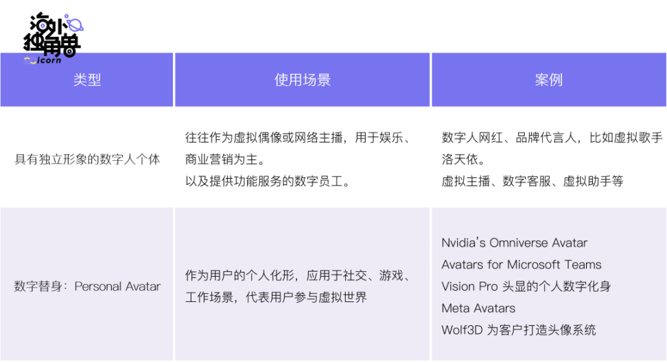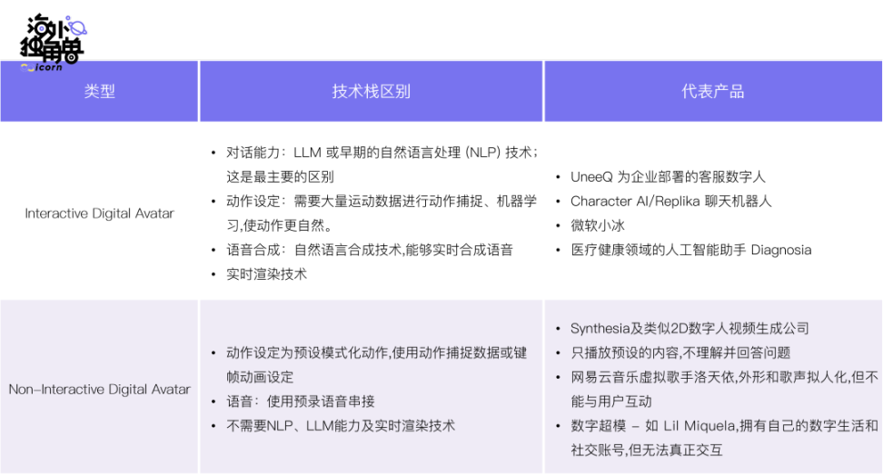 根据产品能力可以被划分为 Interactive Digital(交互式数字人)、Non-Interactive Digital(非交互数字人)。另外根据应用场景还可以分为具有独立形象的数字人个体以及代替特定人的数字替身。
