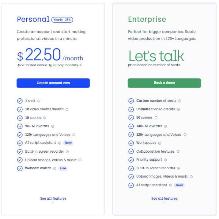 • 定价:Synthesia 的价格略高于 D-ID 和 Heygen,不具备明显优势。