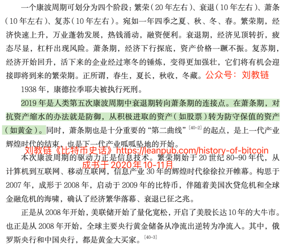 一个主要原因是想真金白银地试验一下红利指数抗衰退的能力。大家知道教链在 2020 年下半年写了《比特币史话》(https://leanpub.com/history-of-bitcoin )。在第十章「中本聪的生日」之第 40 话「大萧条」一节,给读者介绍了人类目前可辨识的最长波经济周期——康波周期,并提出,“2019 年是人类第五次康波周期中衰退期转向萧条期的连接点。在萧条期,对抗资产缩水的办法就是防御,从积极进取的资产(如股票)转为防守保值的资产(如黄金)。”(见下图)