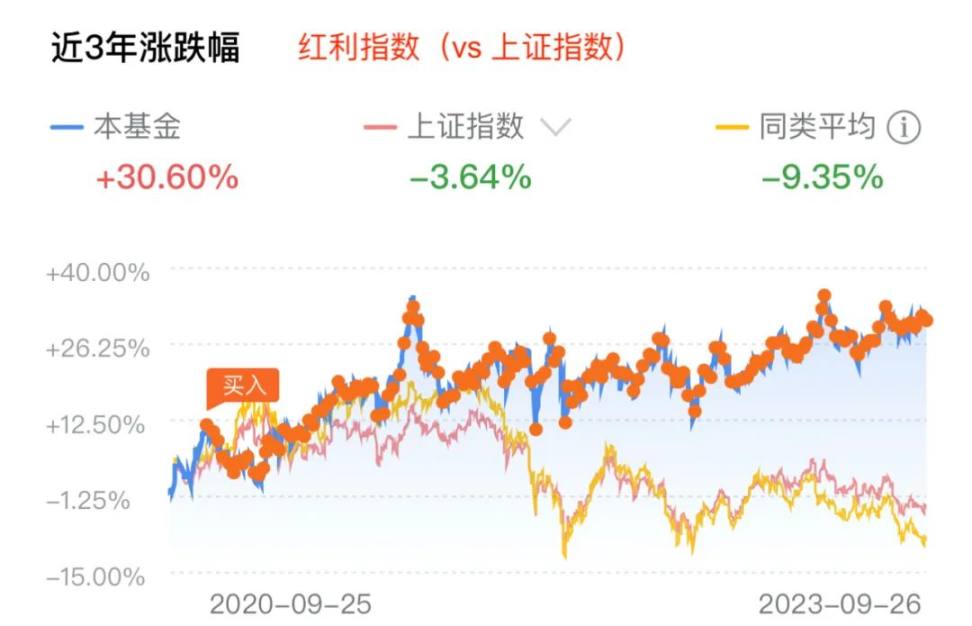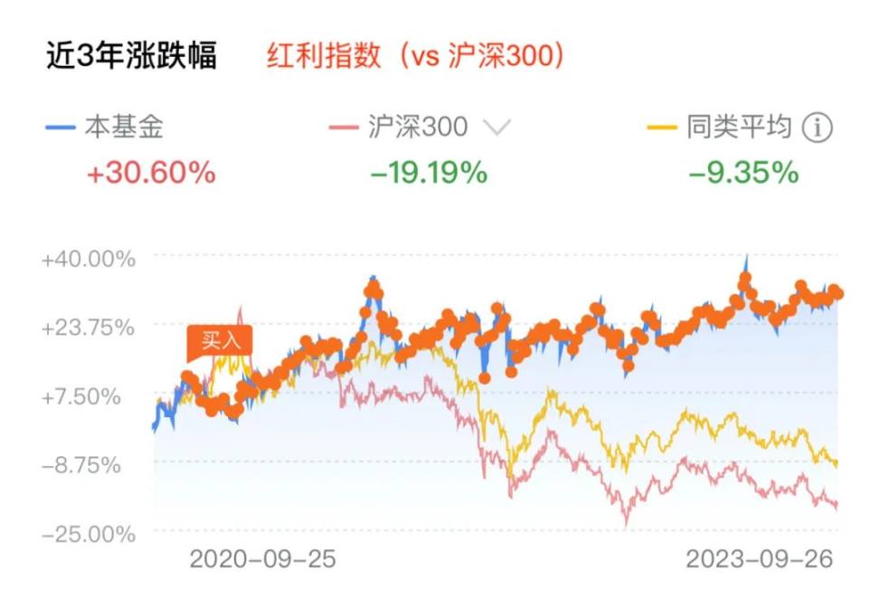 前些天有读者在评论区问教链有没有投资大 A。有的。根据教链多次提过的“三个池子”理论,大 A 的仓位属于二池。二池里有股票基金和股票。目前教链持仓的是红利指数基金,该基金在过去 3 年的高通胀和 180 度转弯的美联储货币政策以及全球经济衰退的阴影笼罩下,净值依然稳步增长了 30% 多,比同期股指代表沪深 300 的接近 -20% 的跌幅大幅度跑赢,一涨一跌,就相差了近 50%。见下图: