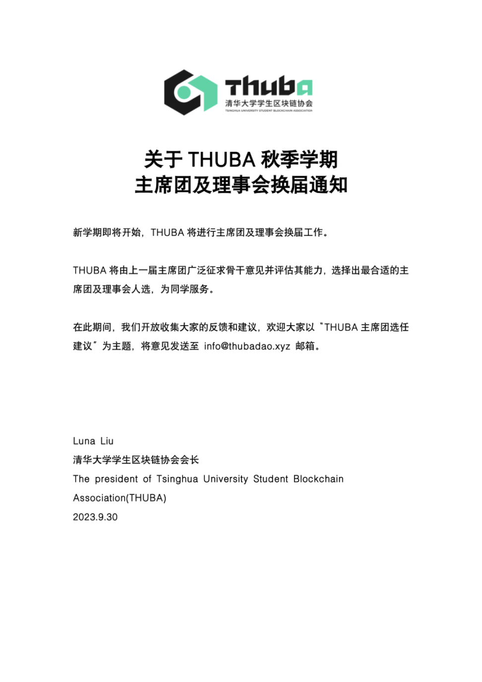 【公告】关于 THUBA 秋季学期主席团及理事会换届通知
