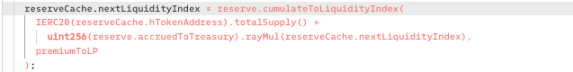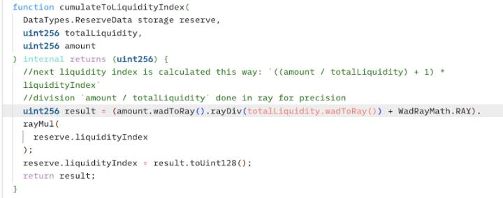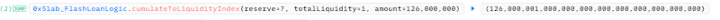 由于池子在黑客操作前为空,还款后 totalLiquidity 仅为 1,amount 是 126000000,初始 liquidityIndex 为 1,得出结果为 126000001。