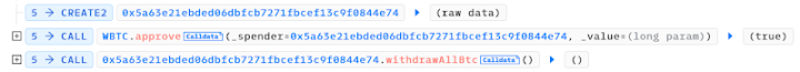 为了取出之前的投入 wBTC,攻击者部署了另一个攻击合约:0x5a63e......844e74,并调用其中的 withdrawAllBtc() 方法