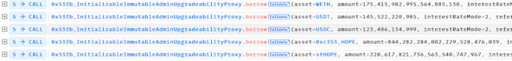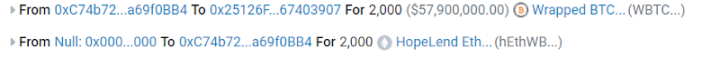 攻击者接着将 1 个最小单位的 hEthWBTC 为抵押,从 HopeLend 的其他五个代币池借出了大量资产。