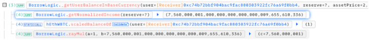 由于之前贴现率已被黑客操纵且贴现率会以 normalizedIncome 乘数计入抵押价值计算,其手中的一单位 hEthWBTC 抵押价值高达 75.6WBTC。