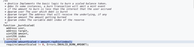 hEthWBTC 的 burn 方法调用了高精度除法 rayDiv。