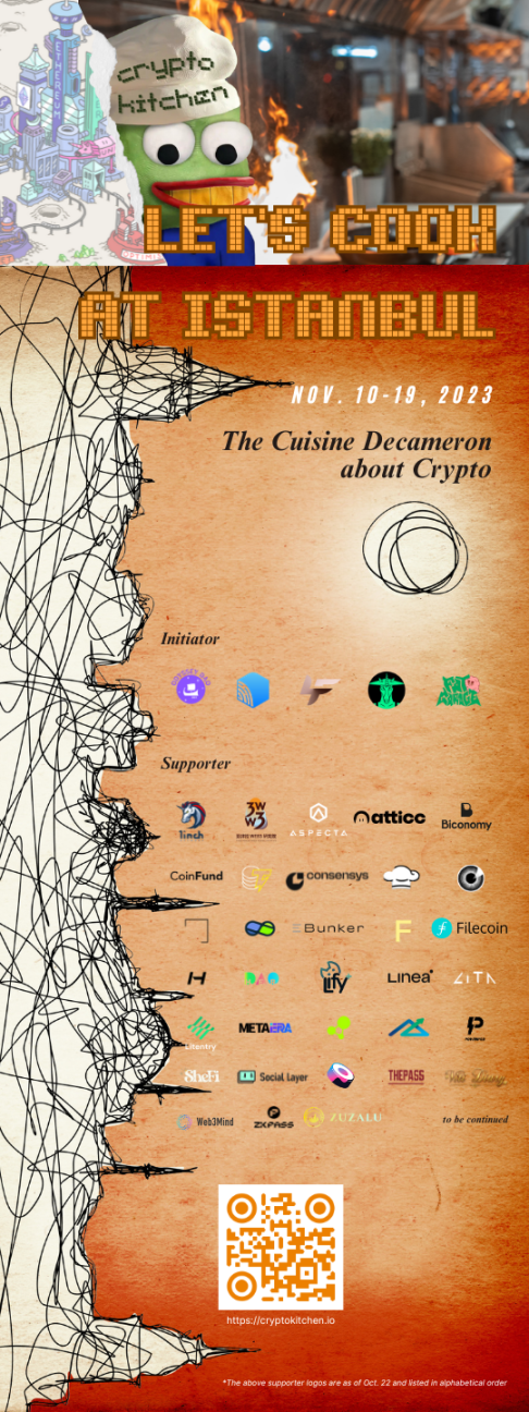 11 月 10 日至 19 日,由 Odyssey DAO、DataverseOS、Fusion Labs、Buidler DAO 和 Fat Garage 胖车库共同发起的 CryptoKitchen23 在土耳其伊斯坦布尔举行,将邀请各领域思想领袖和先锋项目创始人担任主厨,通过下午茶、烹饪美食等形式和全球加密建设者、爱好者一起分享其探索创造背后的思想、行动和故事。
