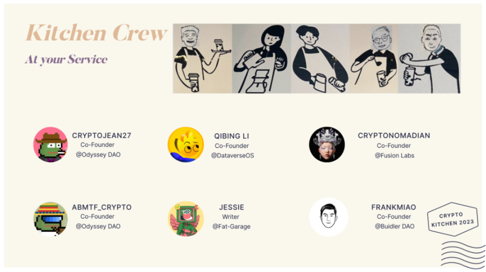 CryptoKitchen23 是由 Odyssey DAO、DataverseOS、Fusion Labs、Buidler DAO 和 Fat Garage 胖车库发起组织的全新活动,是各个加密生态系统的聚集地和轻松的后台故事会。