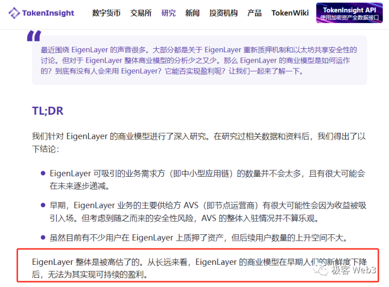 图片来自 TokenInsight 的文章——《Restaking 之王:EigenLayer 的商业模型是金点子还是糟粕?》