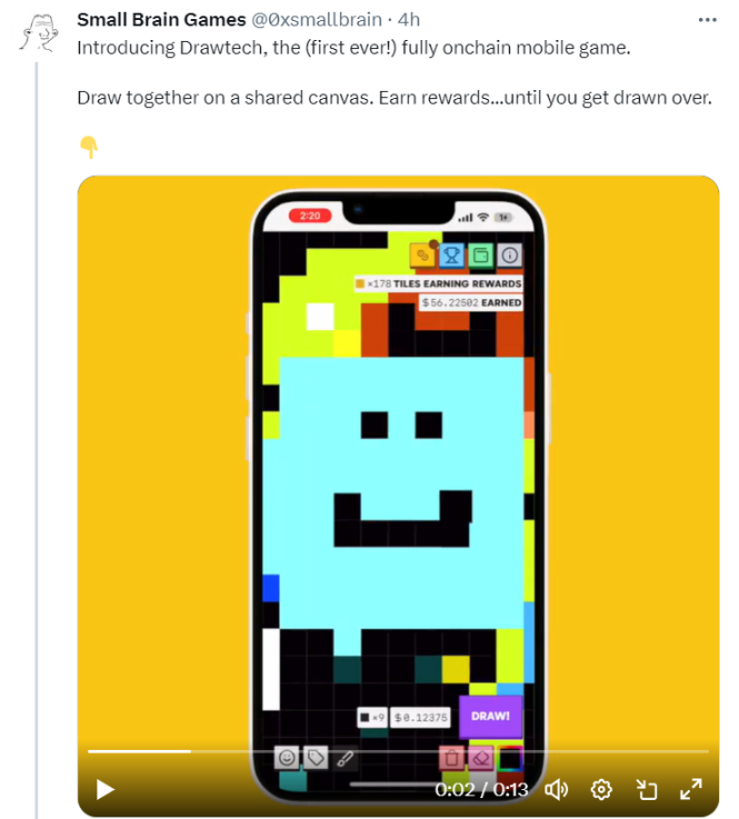 Drawtech, launched by Small Brain Games on November 1, 2023, is a fully on-chain mobile game. The gameplay involves coloring tiles, with prices that fluctuate based on demand. Players act as artists and aim to color tiles, securing ownership as quickly as possible to earn rewards. The game operates on the Base mainnet, an Ethereum L2, and has garnered significant attention with a hundred thousand views.