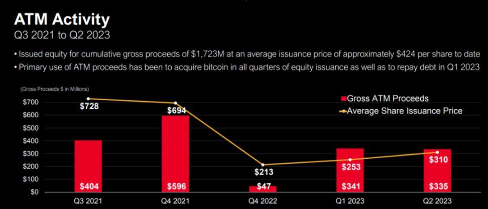 发行新股筹集资金是 MSTR 的另一个融资手段。自 2021Q3 以来,MSTR 通过 ATM 计划筹集总计 17 亿美元,增发股票均价约为 424 美元 / 股。筹集资金的主要用途自然也是购买更多比特币。