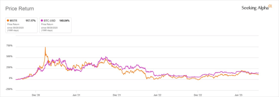自三年前买入并持有比特币的策略推出以来,MSTR 股价就与比特币价格之间展现极强的相关性。如下图所示: