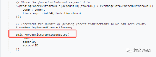 用户直接在 Layer1 上通过 ExchangeV3 合约中的 forcedWithdraw 函数发起强制提款,声明自己在路印协议的 L2 账户是哪个,以及要提走哪种 Token。之后,ExchangeV3 合约会抛出一个链上事件,提示有人发起了强制提款请求。由于路印协议的所有节点(包括 Sequencer)都运行着 Geth 客户端,所以会从以太坊区块中获知,有人发起强制提款并触发了对应的链上事件。
