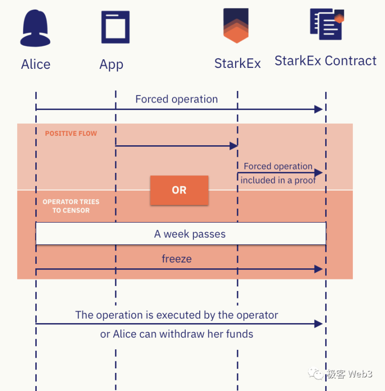 在 StarkEx 的文档中,还为这一过程画了专门的示意图。如果 L2 用户在 L1 提交的 Forced Withdrawal 请求在 7 天窗口期结束时,未得到定序器响应,则该用户可以调用 freeze Request 功能让 L2 进入冻结期。此时,L2 定序器将无法在 L1 上更新 L2 的状态,L2 状态冻结后要过 1 年才能解冻。之后用户可以提交 merkle proof 并提款。