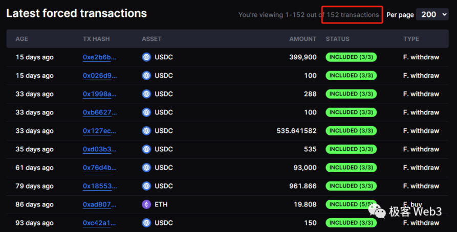 (根据 L2BEAT dYdX 浏览器显示,迄今为止 dYdX 强制交易 / 提款功能,总计被使用过 152 次,超过 100 万美元的大额提款多达 7 笔)