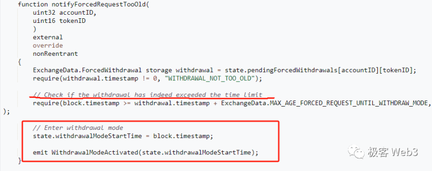 如果 Sequencer 在 15 天内没有响应用户的强制提款请求,用户可以调用 notifyForcedRequestTooOld 函数,让 ExchangeV3 合约抛出名为 WithdrawalModeActivated 的事件,通知路印协议的全节点,破产清算模式被激活了。