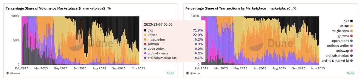 今年 5 月底,OKX Web3 钱包全面上线 Ordinals 市场,凭借其丝滑的产品体验、最全面的功能、最优的流动性、以及 0 手续费等优势,一经推出就收获好评如潮,成为入户入局比特币生态的首选平台。据 Dune 数据显示,当前比特币 Ordinals 交易占比近 70%,位列行业第一。