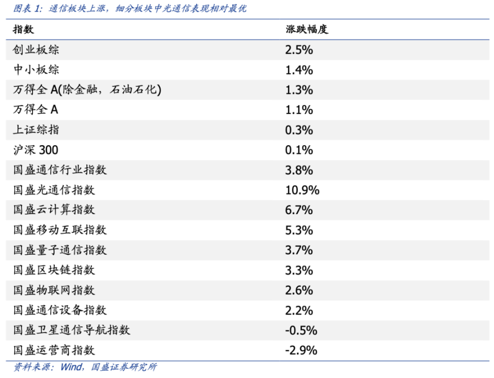 二、行情回顾:通信板块表现上涨,光通信表现最佳
