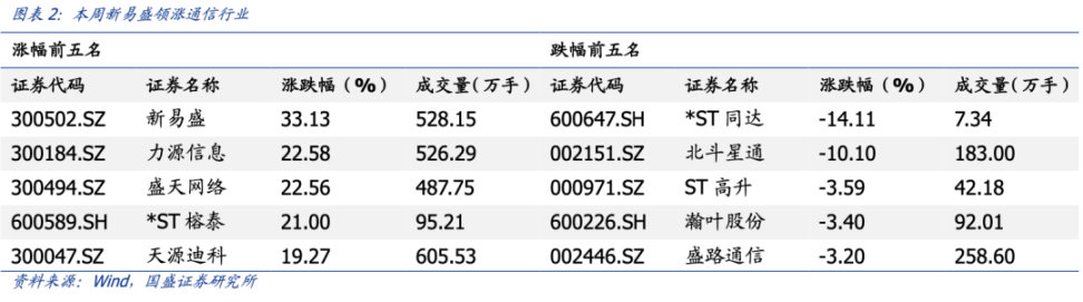 本周受益光通信概念,新易盛上涨 33.13%,领涨板块。受益半导体存储概念,力源信息上涨 22.58%,受益游戏概念,盛天网络上涨 22.56%,受益公司预重整,*ST 榕泰上涨 21.00%,受益华为概念,天源迪科上涨 19.27%。