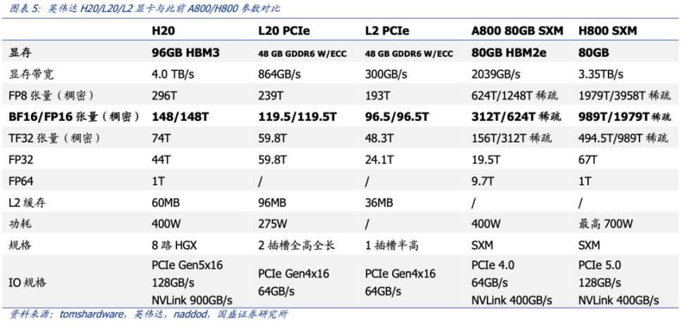 英伟达或发布 H20/L20 系列,通过降低核心算力、提升 IO 带宽的方式在绕过 BIS 贸易限制条款的同时,凭借 CUDA 生态和组网规模优势,有望保持在国内市场的竞争壁垒。我们认为,H20 对通信网络的需求量有望进一步上一个台阶,在同等算力下,对光模块、MPO&AOC、交换机的需求量有望增加,通信网络在算力集群中的价值量有望提升。同时,H20 以组网和软件弥补单卡算力不足,有望提升算力建设方的技术壁垒,同时组网规模的增加,算力集群将更加依赖算力调优。