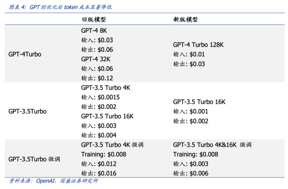 应用奇点的背后,是 AI 算力成本不断降低铸造的坚实底座。OpenAI 表示,目前 GPT 每单位 token 成本已经大幅降低,GPT-4Turbo 输入降价到原来的 1/3,为 1 美分 / 千 token,输出降价到原来的 1/2,为 3 美分 / 千 token,同时不再设置上下文长度区分,统一 128K,相当于 300 多页文本内容。我们认为,token 成本降低,或因 OpenAI 解决了此前算力利用率低、GPU 平均故障时间较长的问题,在此,网络调优、模型调优对算力成本的降低作用愈发显现,算力调优从成本降低的维度加速了 AI 飞轮的旋转。