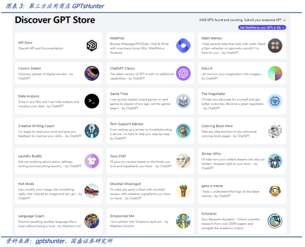 本周 GPTs 上线,引爆 AI 应用创作的“iOS 时刻”。OpenAI 在本周的开发者日上发布自定义 GPT,同时上线 GPTs 商店,截至 11 日 16 点,第三方应用商店 GPTs 已上架超过 4300 个应用,功能令人眼花缭乱,涵盖数学、绘画、GIF 生成、智能助理等,彻底打开 ChatGPT 使用方式的想象空间。我们认为,AI 的“iOS 时刻”真正来临,自定义 GPT 和 GPTs 商店有望复现十余年前苹果 App Store 上线时创造的应用爆发奇点。