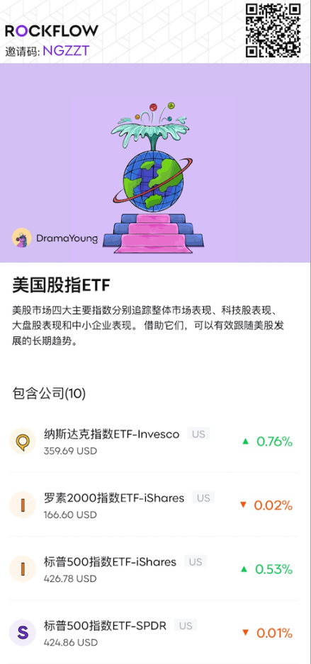 RockFlow 投研团队最新推出的股单—— 美国股指 ETF,包含了当前追踪美股市场四大主要指数的高流动性 ETF,便于各位选择自己看好的种类进行较为平稳的投资。