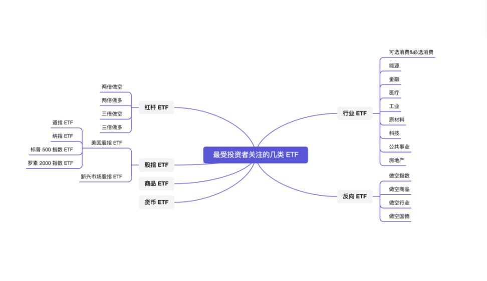 以下我们详细介绍四类最受投资者关注的 ETF——行业 ETF、反向 ETF、杠杆 ETF 和股指 ETF。