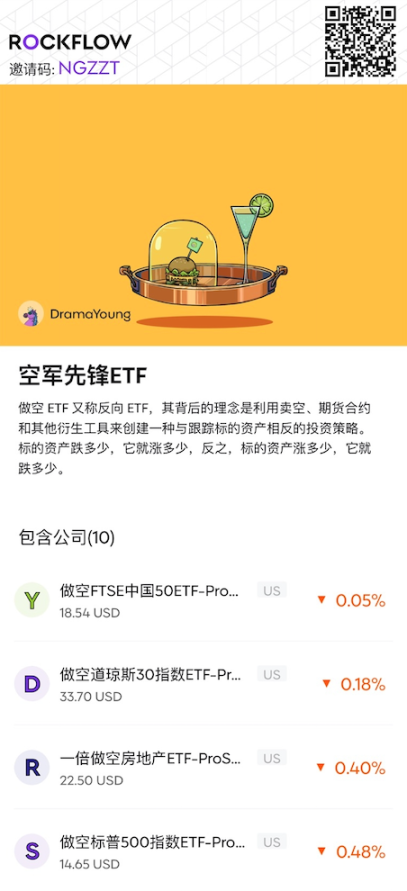 RockFlow 投研团队最近上线的这份“空军先锋 ETF”股单,帮大家精选了针对美股各大指数以及金融、房地产、中国股指等标的的流动性较强的反向 ETF(出于整体阅读体验,下图仅部分展示):