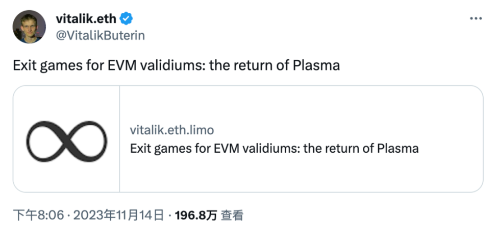 最近,以太坊创始人 Vitalik Buterin 在推特上提到 「Exit games for EVM validiums: the return of Plasma」,这一言论激发了对 Plasma 技术未来角色的广泛讨论,预示着它在提升以太坊网络性能方面可能会发挥重要作用。
